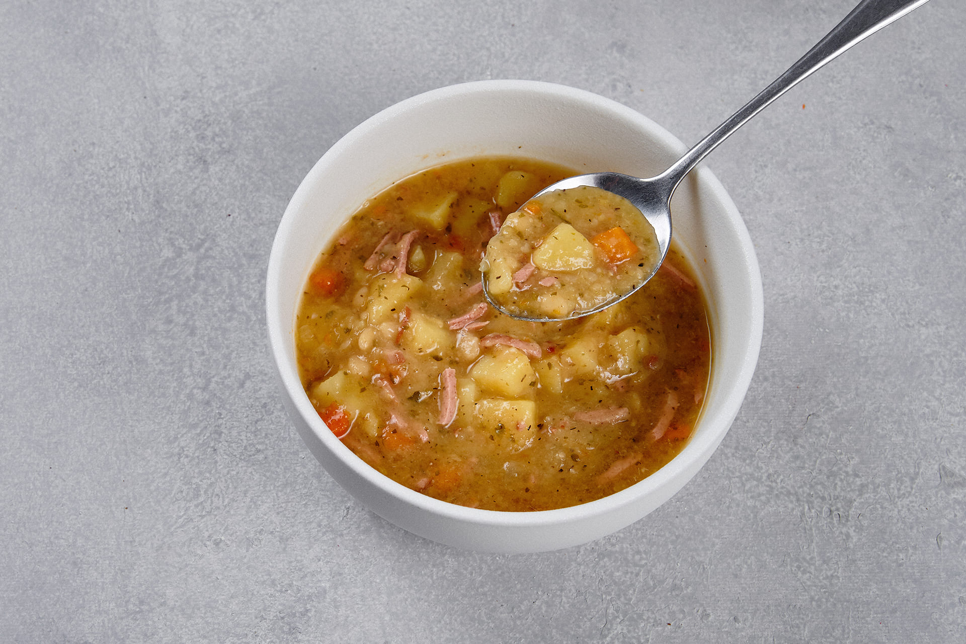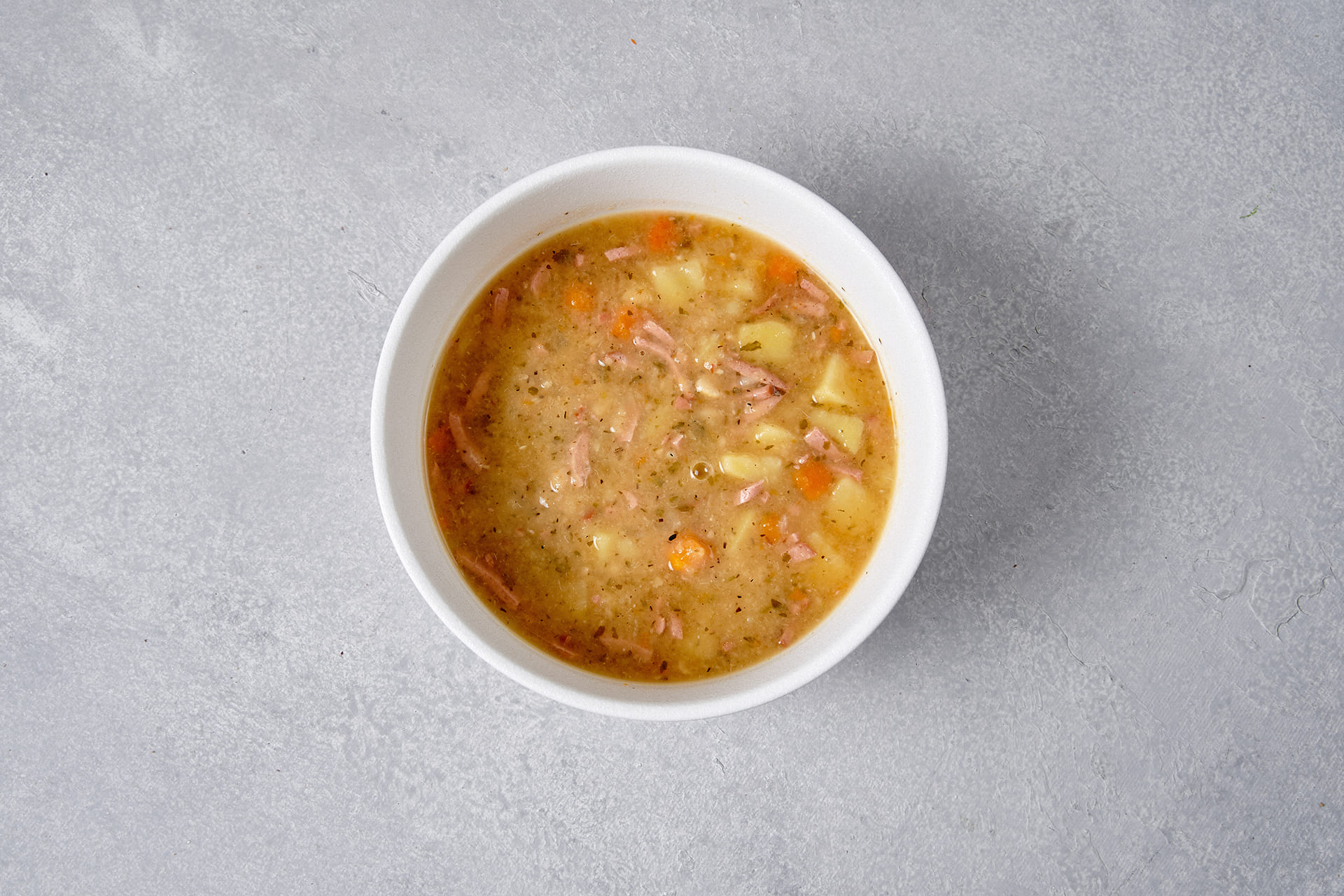 Состав: Горох колотый, бульон, картофель, морковь, лук репчатый, колбаса варено-копченая, масло растительное, чеснок сухой, зелень, смесь приправ и специй.