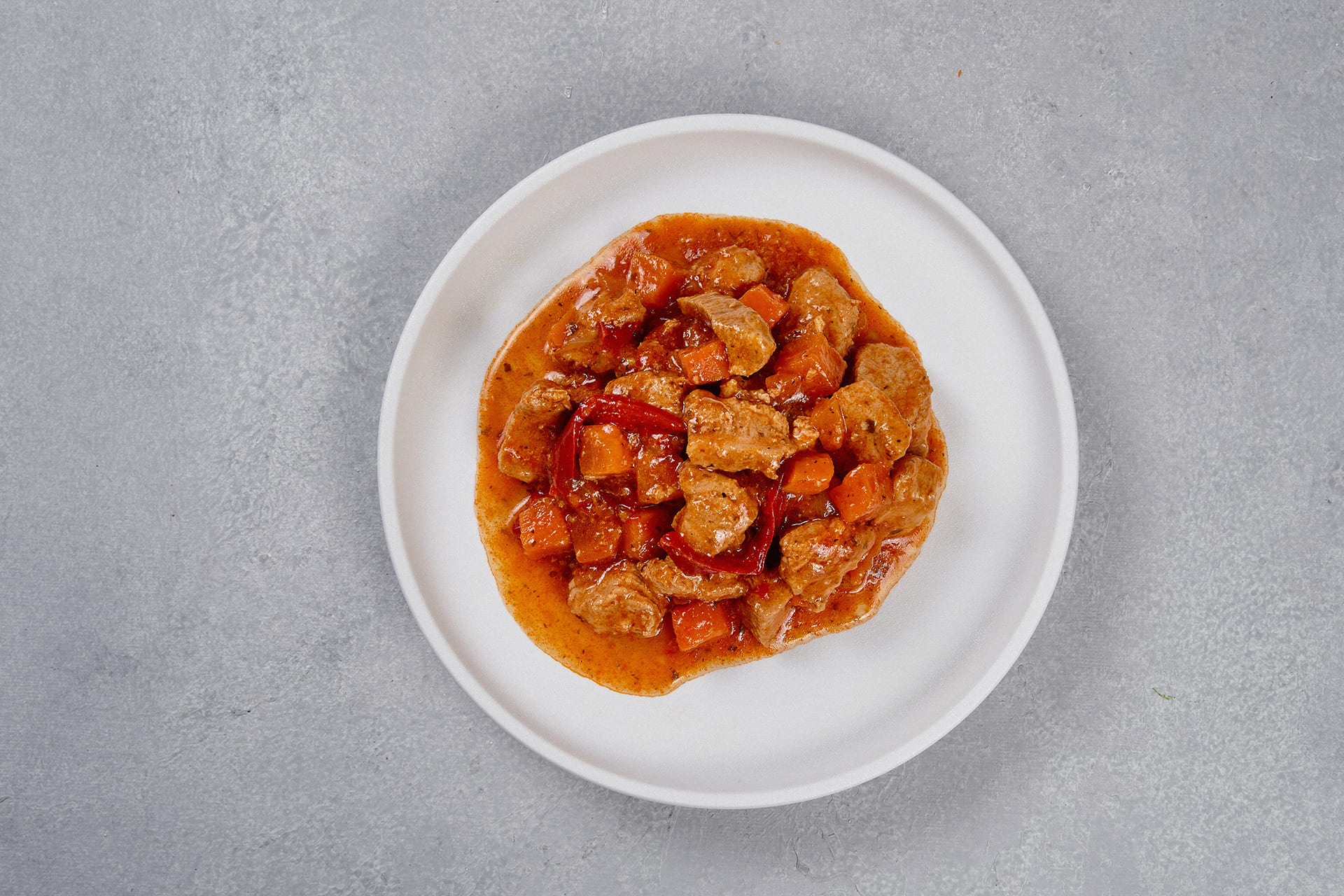 Состав: свинина; вода; лук репчатый; морковь; перец болгарский; томатная паста; масло растительное; крахмал картофельный; соль; сахарный песок; паста перечная; орегано; паприка сладкая; чеснок; перец черный молотый; лавровый лист.