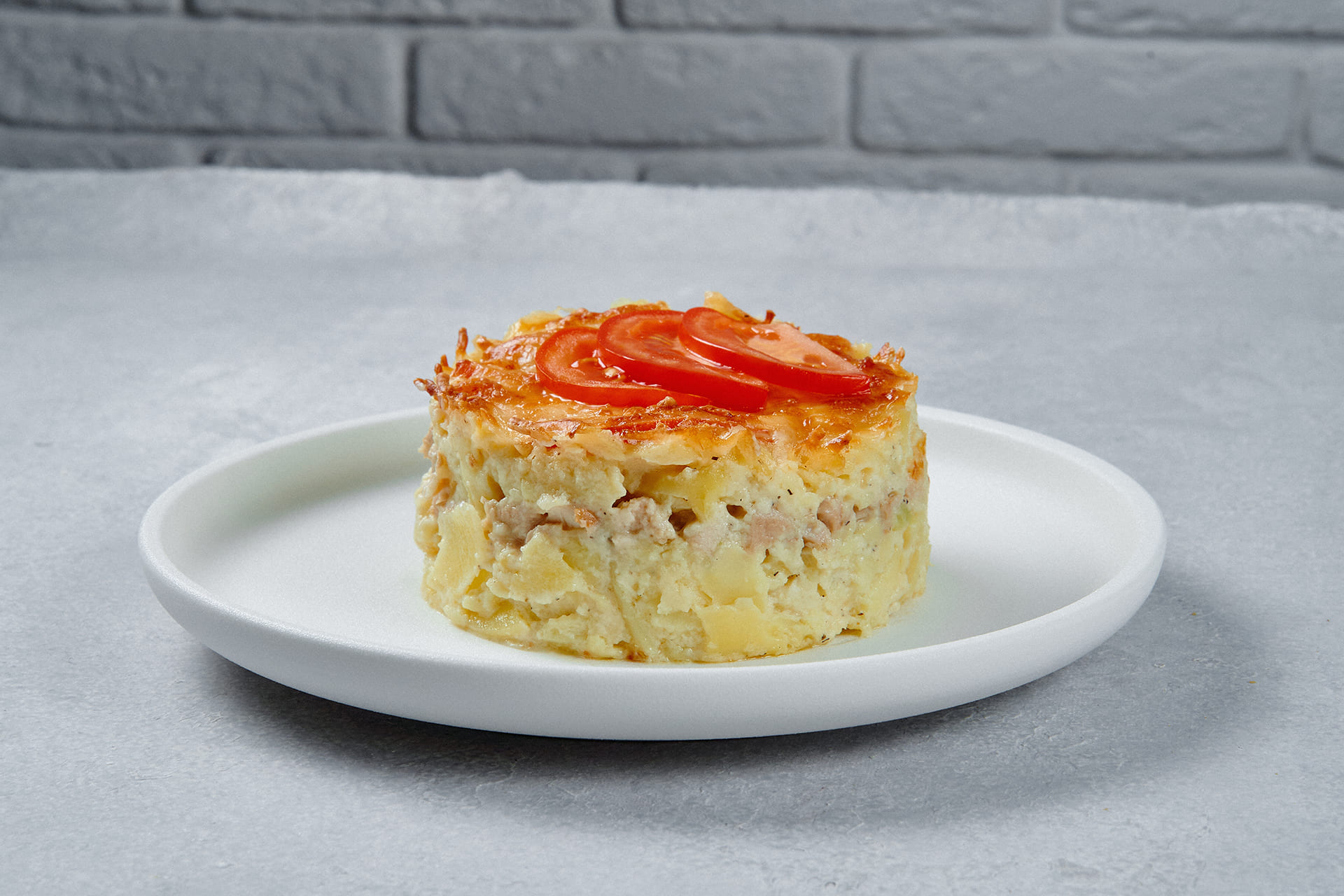 Состав: картофель, свинина, лук репчатый, сыр, майонез, яйцо, помидоры, чеснок, масло растительное, соль, перец черный молотый.