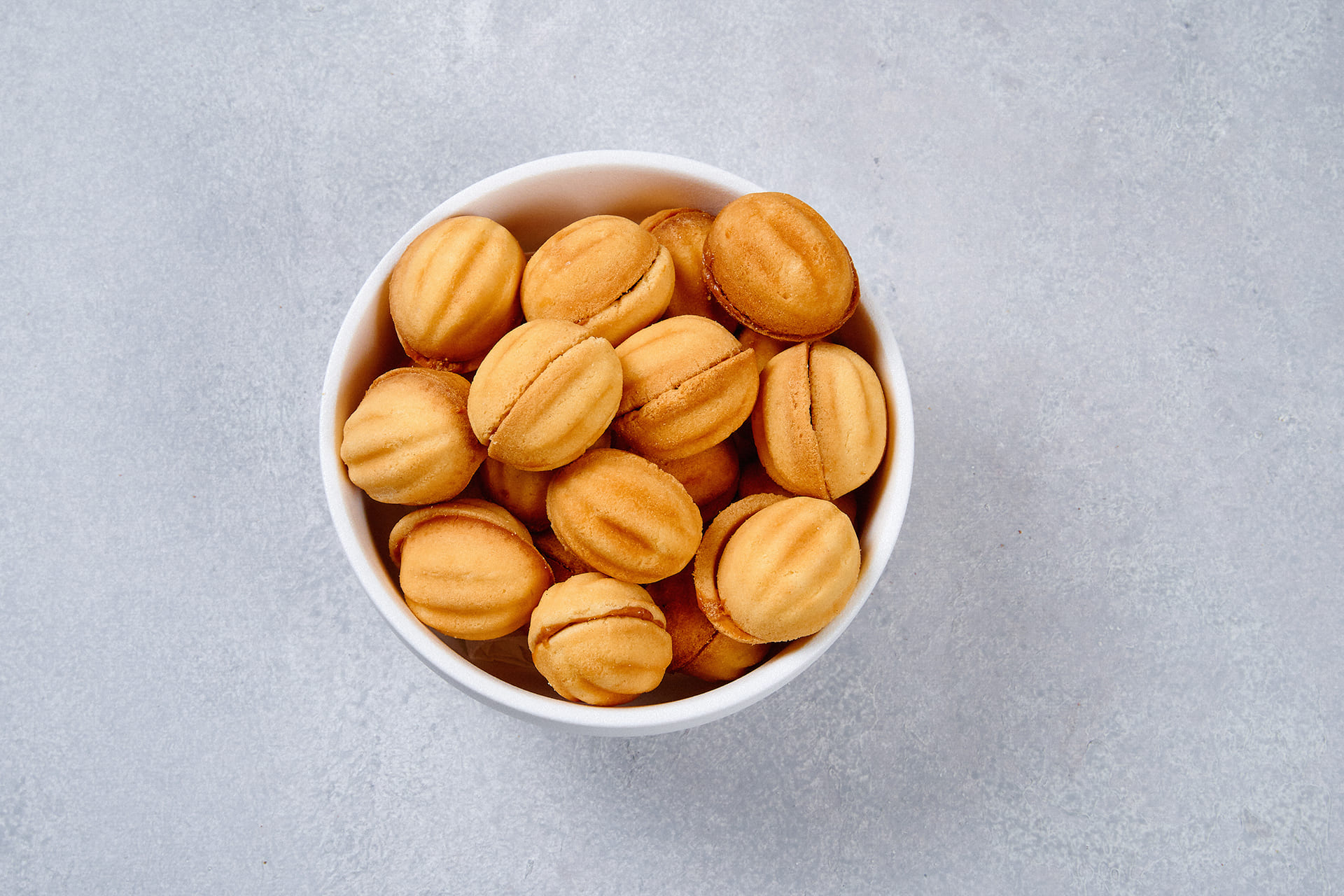 Орешки со сгущенкой - традиционное праздничное печенье в виде ореха и начинкой из вареной сгущенки. Состав: тесто: мука пшеничная в/с, маргарин, сахарный-песок, яйцо, сода пищевая; начинка: вареное сгущенное молоко.