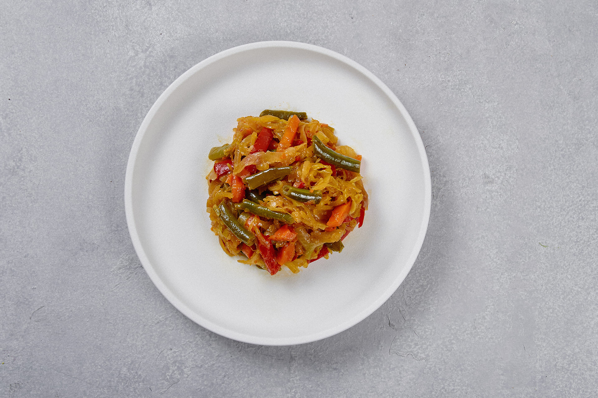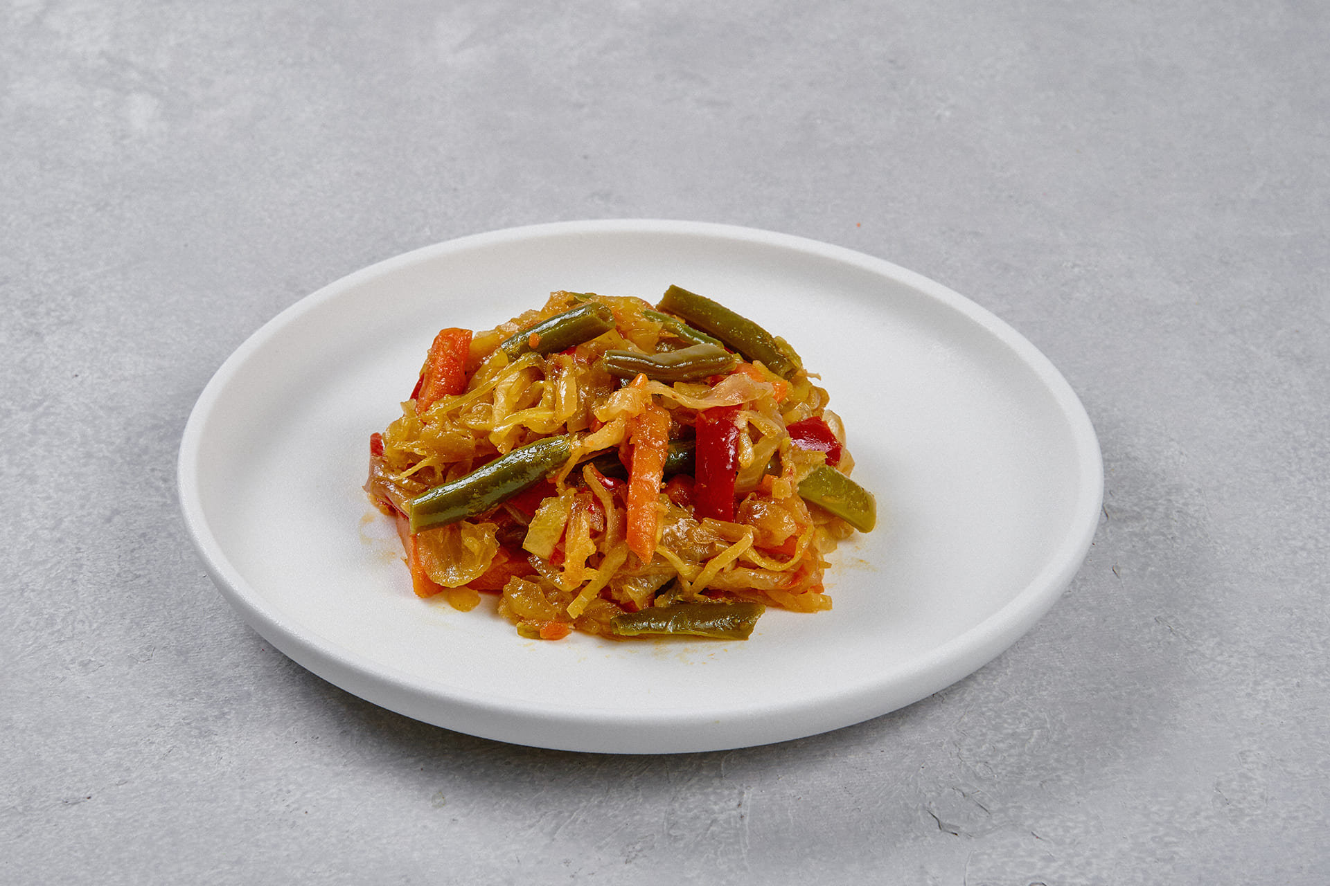 Состав: капуста белокочанная; лук репчатый; морковь; фасоль стручковая; перец болгарский; масло растительное; соевый соус; имбирь сушеный; чеснок; соль; куркума.