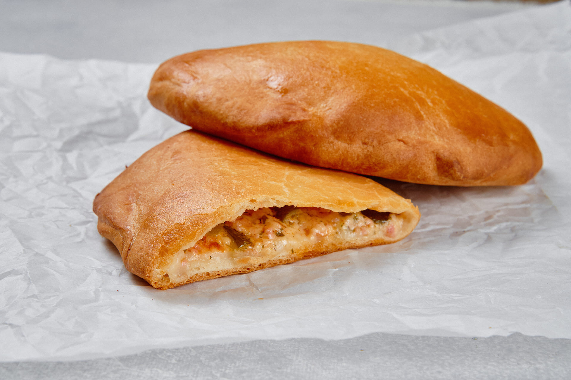 Закрытая пицца с ветчиной, сыром, хрустящими огурчиками и томатным соусом.