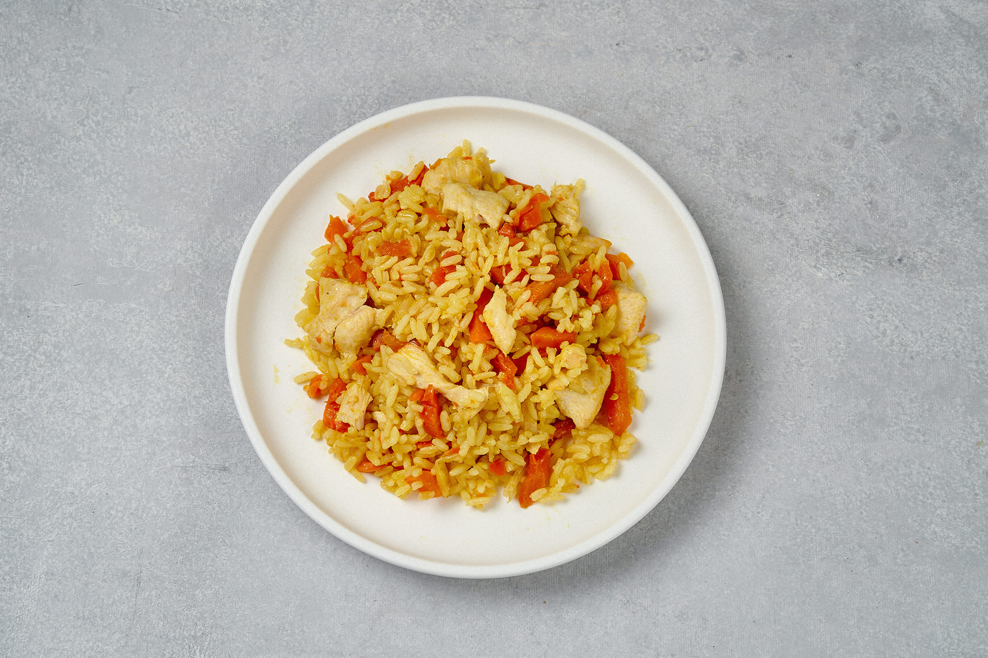Состав: Крупа рисовая, мясо куриное, морковь, лук репчатый, чеснок, масло растительное, приправа для плова, соль.