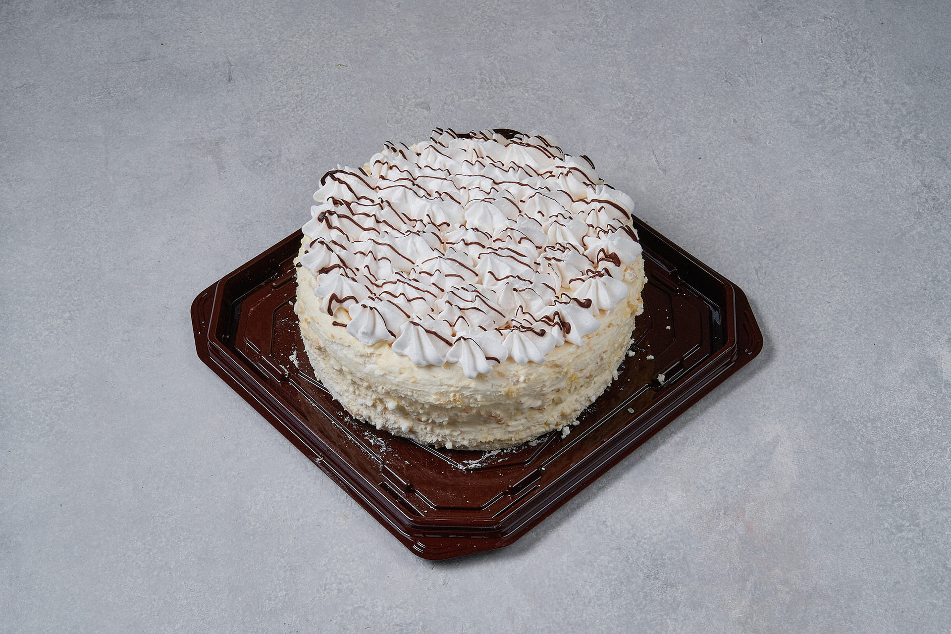 Легкий воздушный торт с ореховыми нотками, нежным сливочным кремом и послевкусием шоколада. Состав: сахарный песок, сгущенное молоко, спред сливочно-растительный 82,5%, сливки, белок сухой, арахис, глазурь шоколадная, коньяк, ванилин, лимонная кислота, сорбиновая кислота.