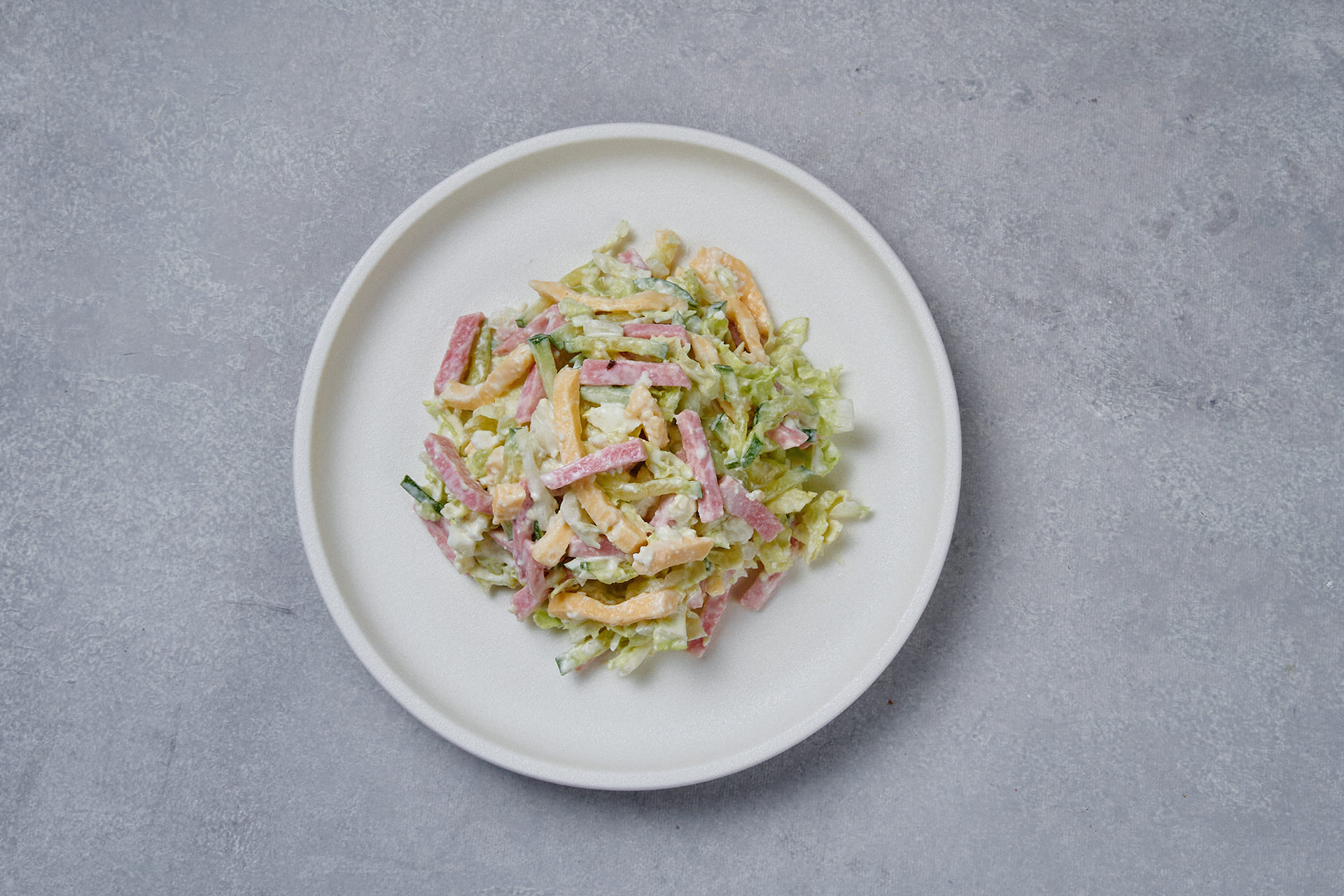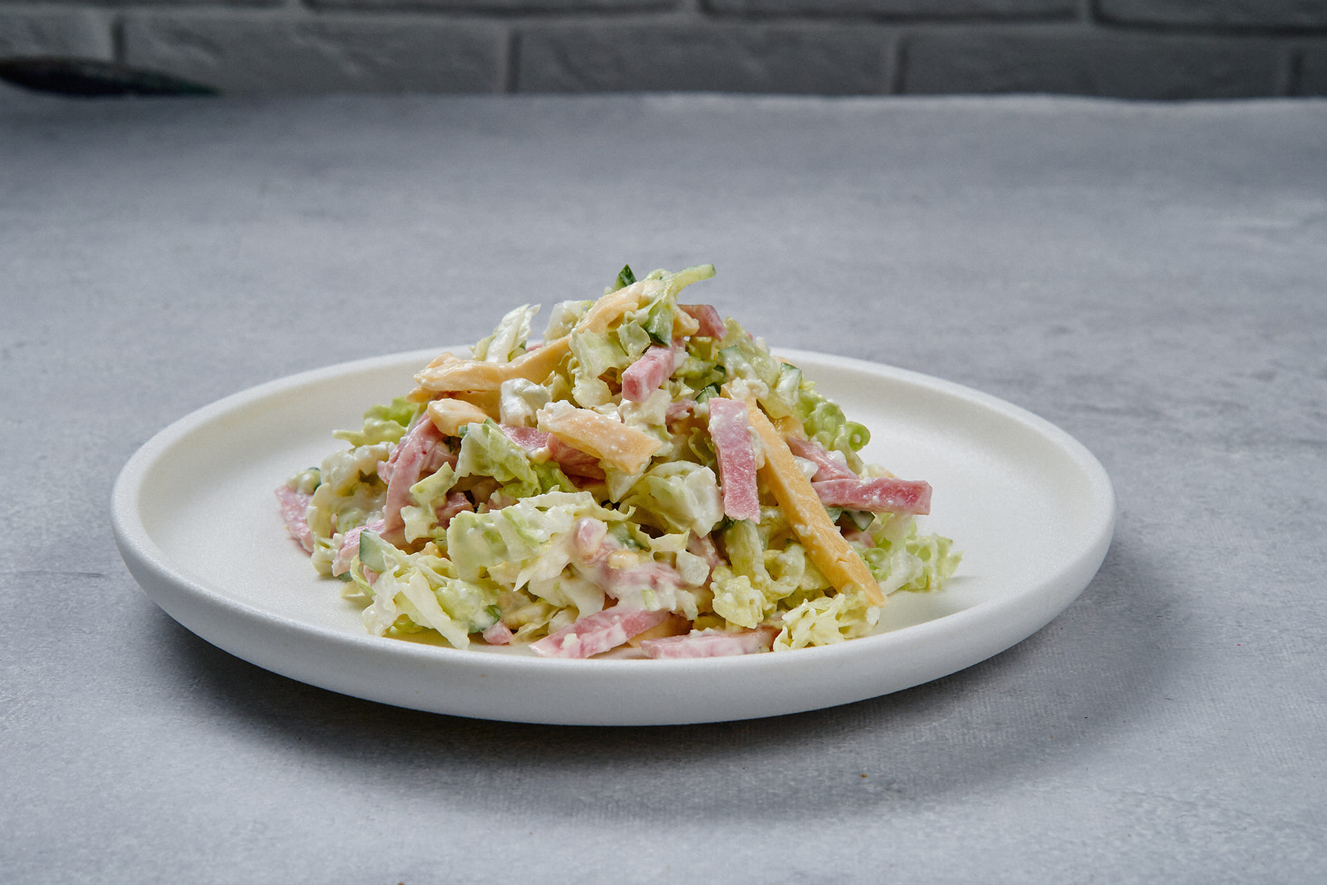 Состав: капуста пекинская, ветчина, мясо куриное, яйцо, огурцы свежие, сырный продукт, чеснок свежий, соль, перец черный молотый.