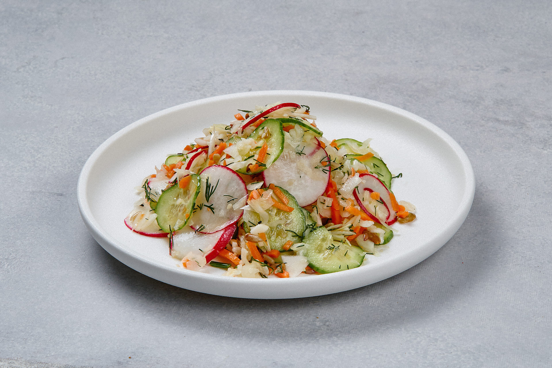 Состав: капуста белокочанная, огурцы, редис, масло растительное нерафинированное, смесь семян (кунжут, лен, тыква, подсолнечник), зелень укропа, соль, перец черный молотый.