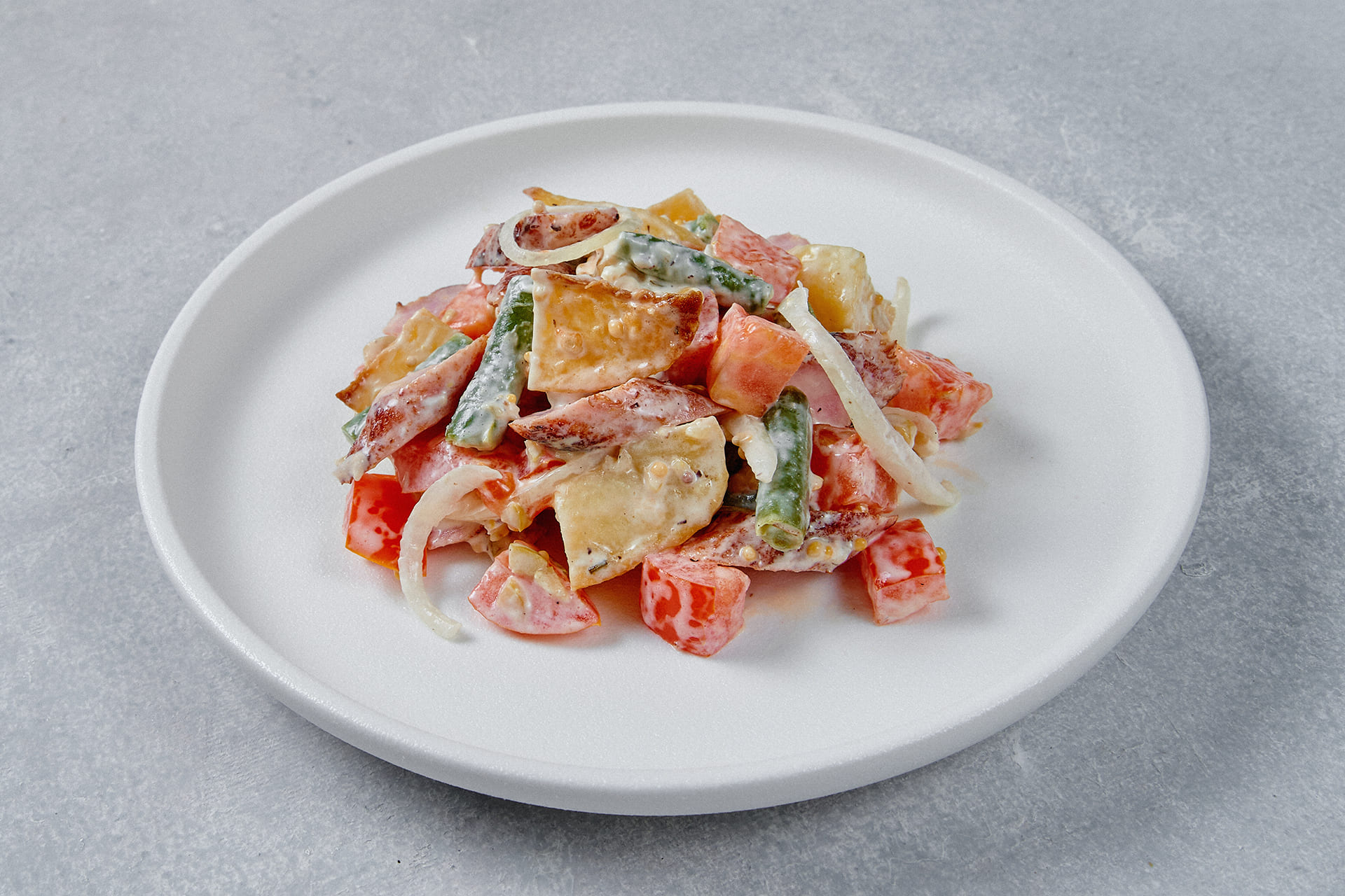 Состав: картофель, фасоль стручковая, томаты, полукопчёная колбаса, соус (майонез, огурцы маринованные, горчица зернистая, оливки, горчица среднеострая), лук репчатый, соль.