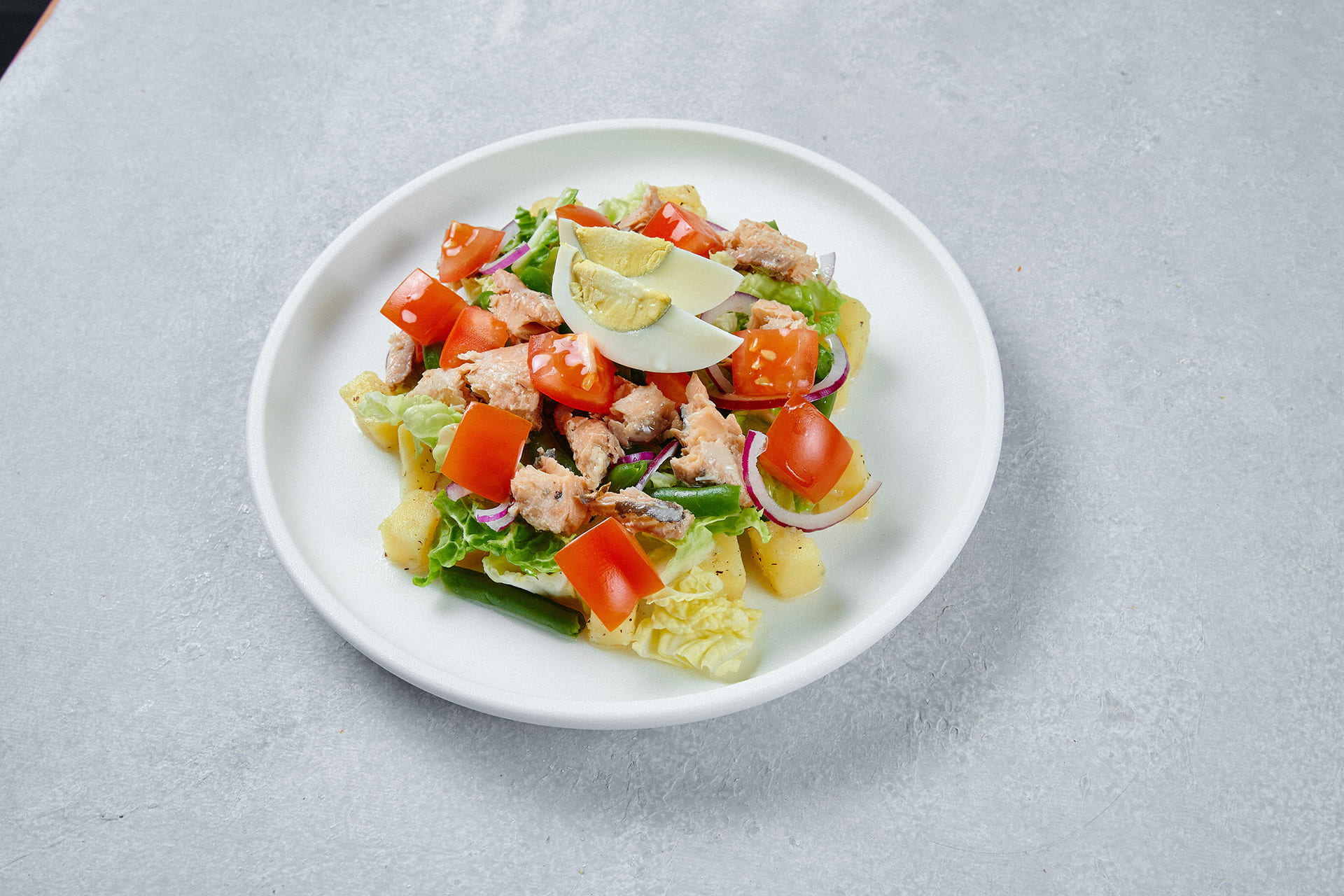 Состав: картофель, горбуша консервированная, фасоль стручковая, капуста пекинская, яйцо, помидоры свежие, масло оливковое, лук репчатый красный.