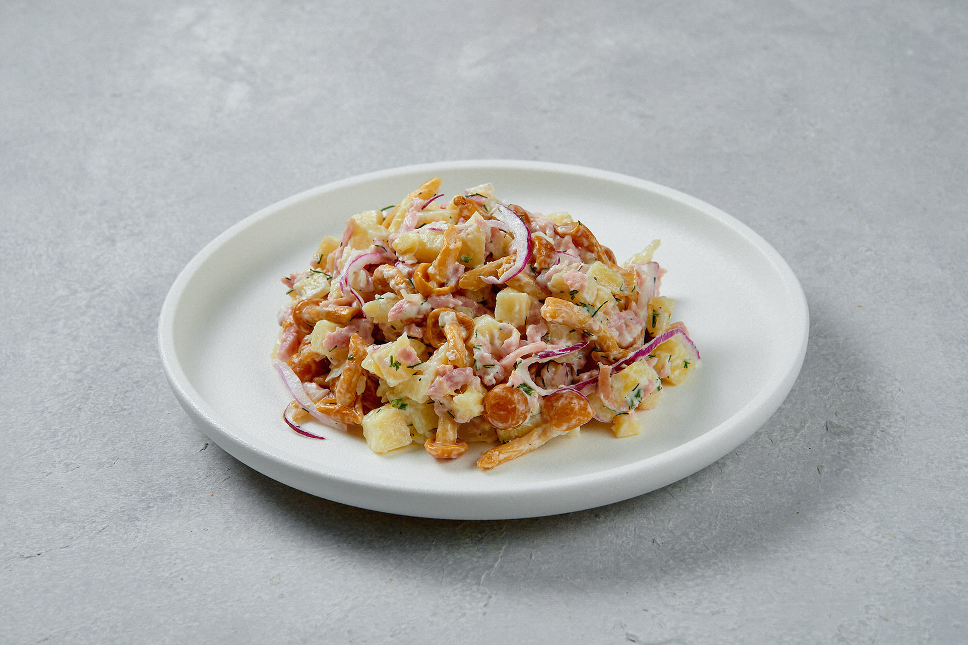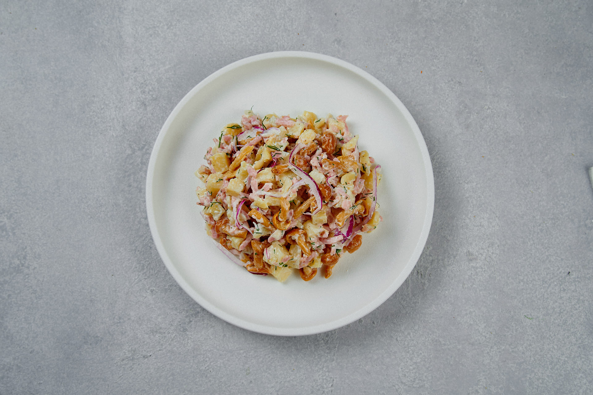 Нежный салат с ветчиной, картофелем и хрустящими опятами. Вкус знакомый с детства — сытный, ароматный и по-домашнему аппетитный.
