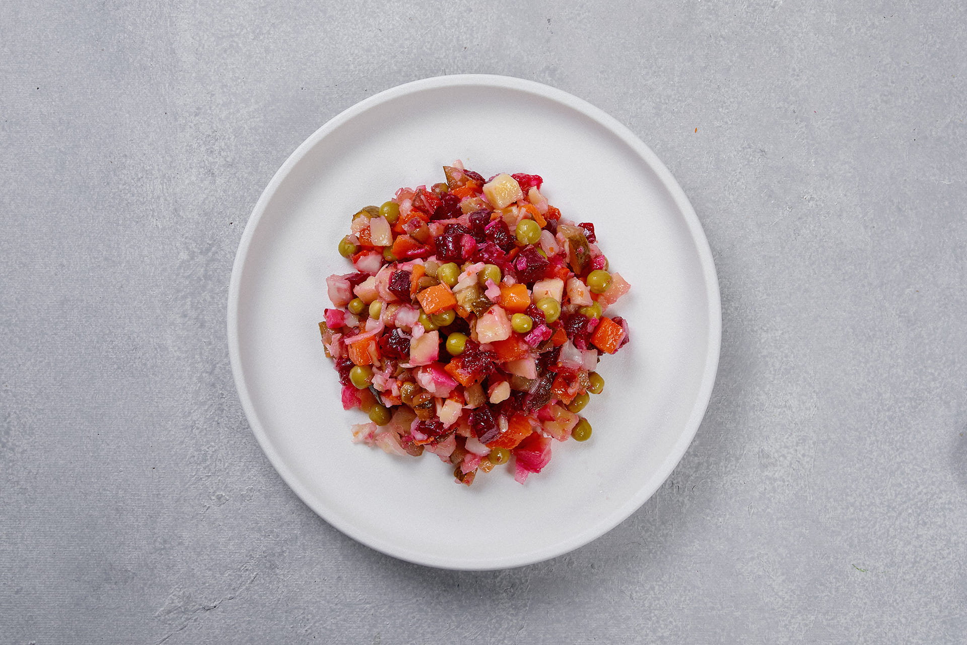 Состав: картофель, свекла, капуста маринованная, морковь, горошек зеленый консервированный, лук репчатый, заправка (масло растительное, мед, горчица столовая, горчица зернистая, сок лимона, соль).