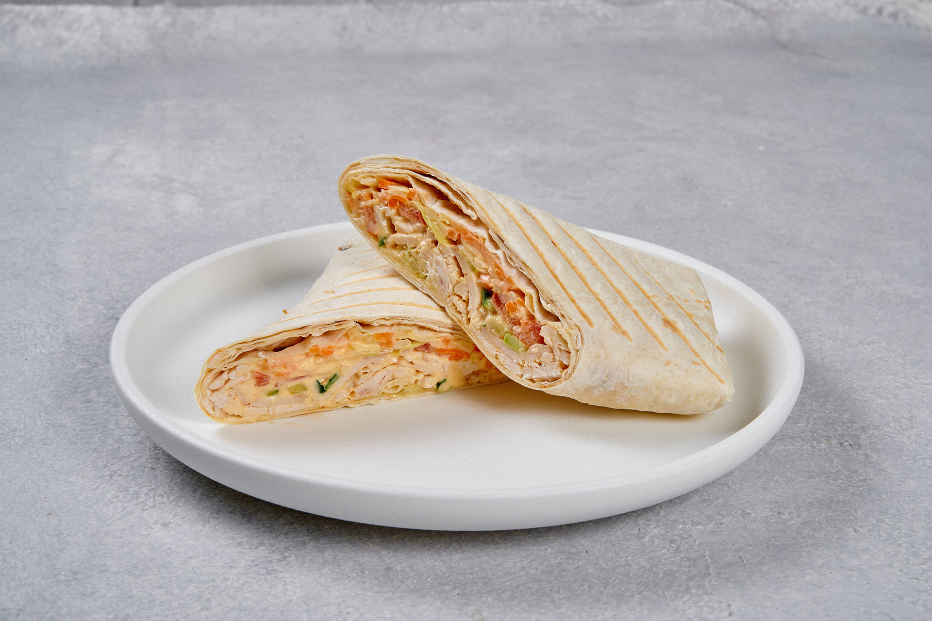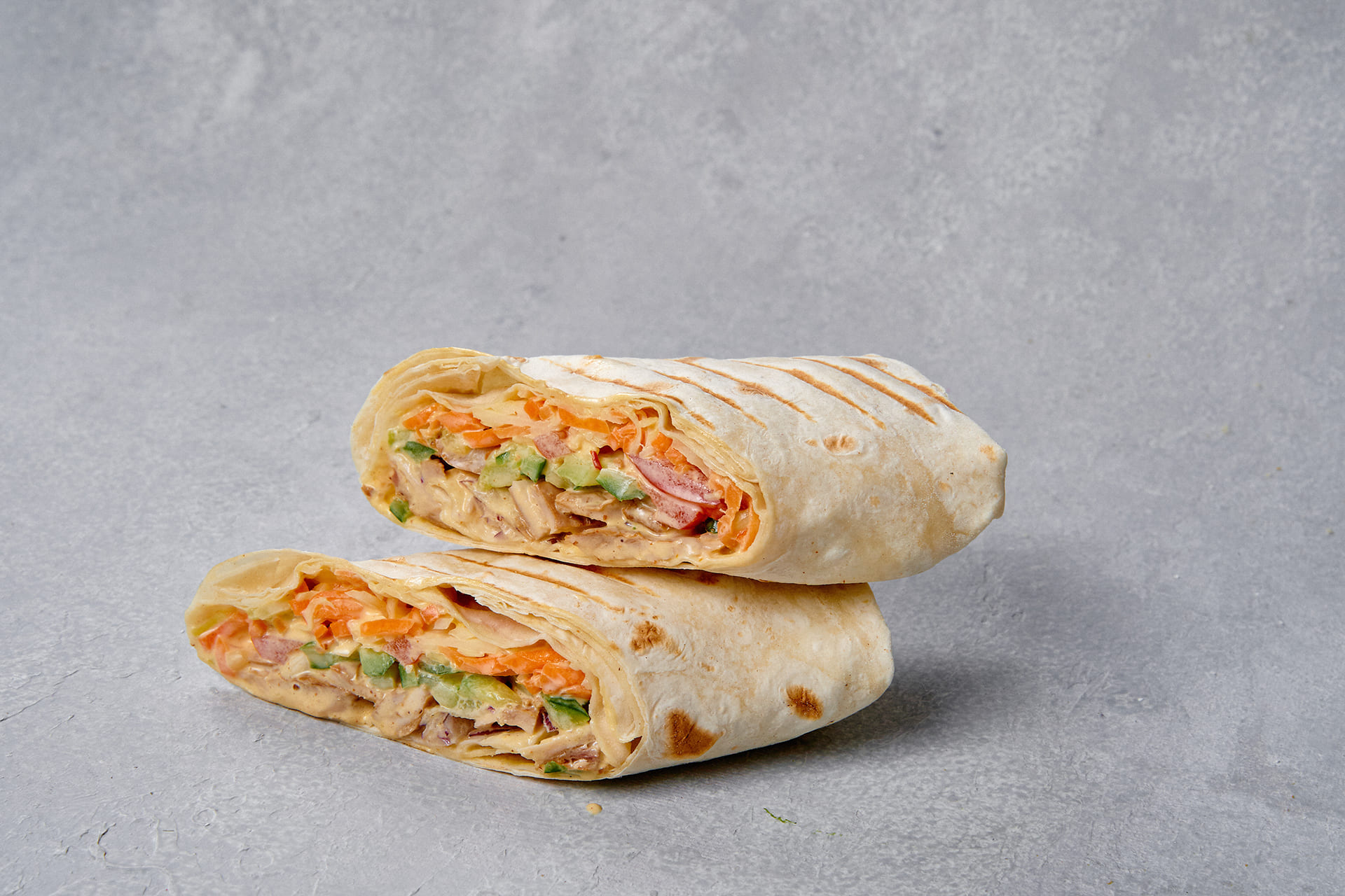 Лаваш с сочной курицей, свежими овощами и морковью по-корейски в ароматном соусе. Состав: лаваш, мясо куриное, капуста белокочанная, огурцы свежие, помидоры, морковь по-корейски, соус для шаурмы (майонез, аджика соус, чеснок).