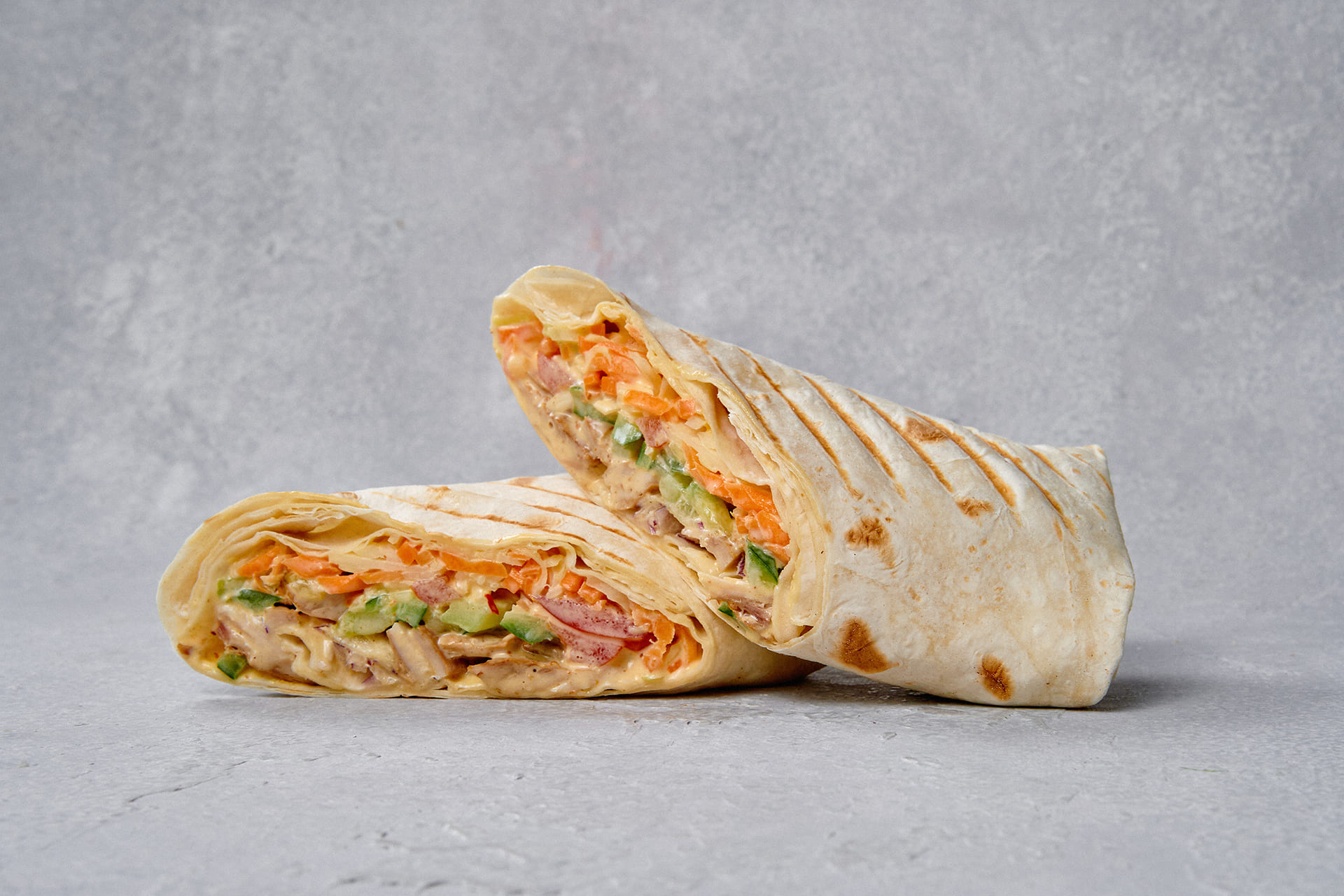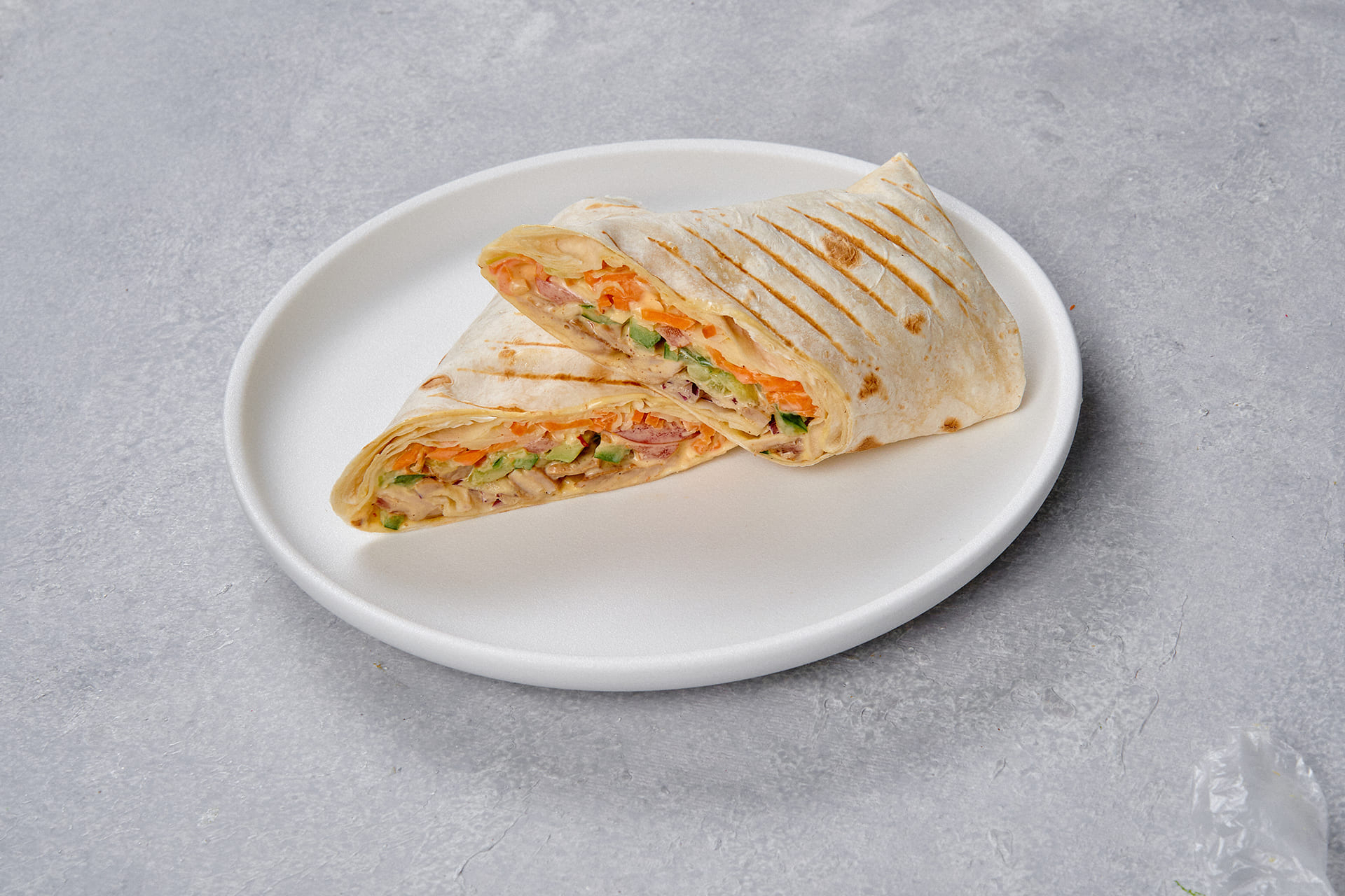 Лаваш с сочной свининой, свежими овощами и морковью по-корейски в пикантном соусе с аджикой и чесноком. Состав: лаваш, свинина, капуста белокочанная, огурцы свежие, помидоры, морковь по-корейски, соус для шаурмы (майонез; аджика соус, чеснок), лук репчатый красный.