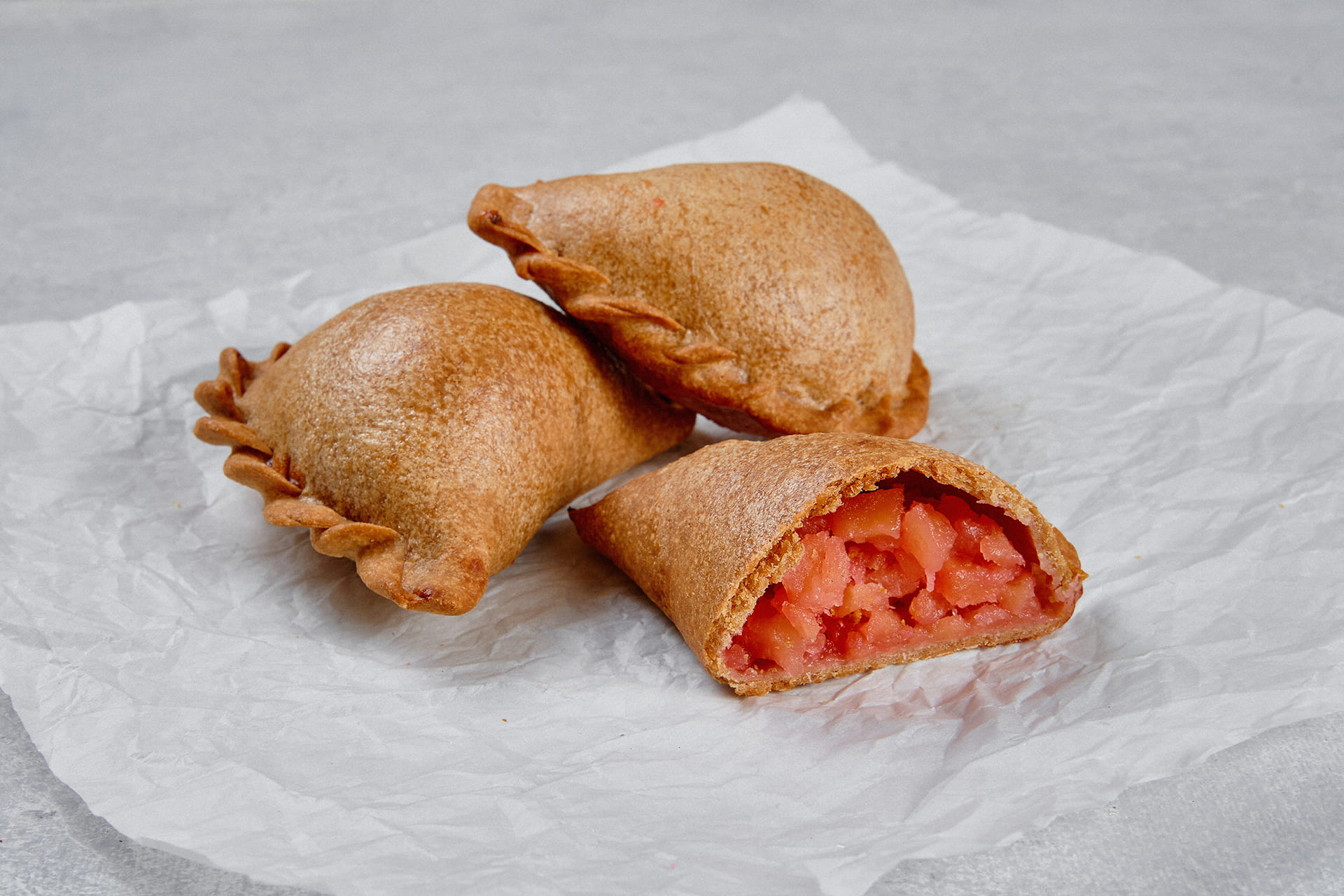 Состав: тесто (мука ржаная, мука пшеничная 1 сорт, вода, масло растительное, разрыхлитель, соль пищевая). Начинка: (яблоки из замороженного сырья, конфитюр вишневый).
