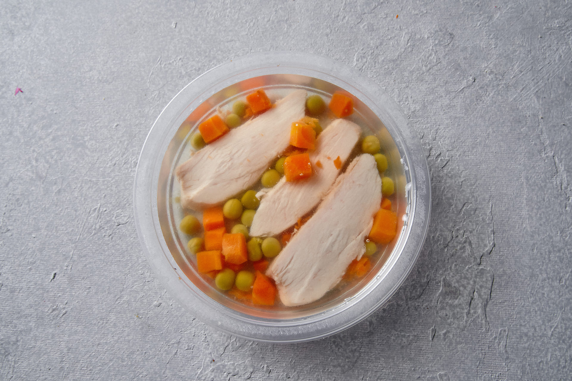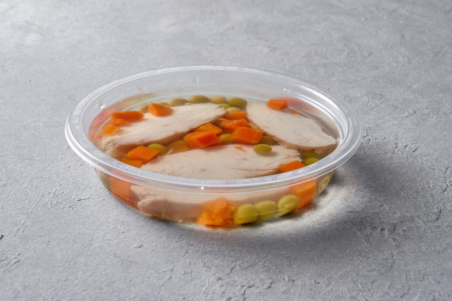 Откройте для себя нежное заливное из куриного филе – идеальное блюдо для тех, кто ценит вкус и заботится о здоровье. Лёгкое, диетическое и невероятно вкусное, оно станет прекрасным украшением праздничного стола или отличным вариантом для полезного перекуса. Состав: мясо куриное, морковь, горошек консервированный. Желе: вода, соль, желирующая смесь(желатин, сахар, соль пищевая).